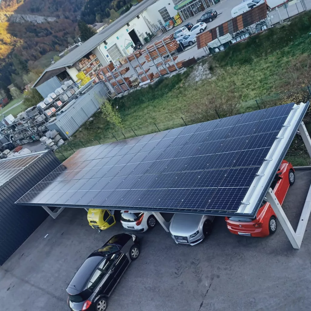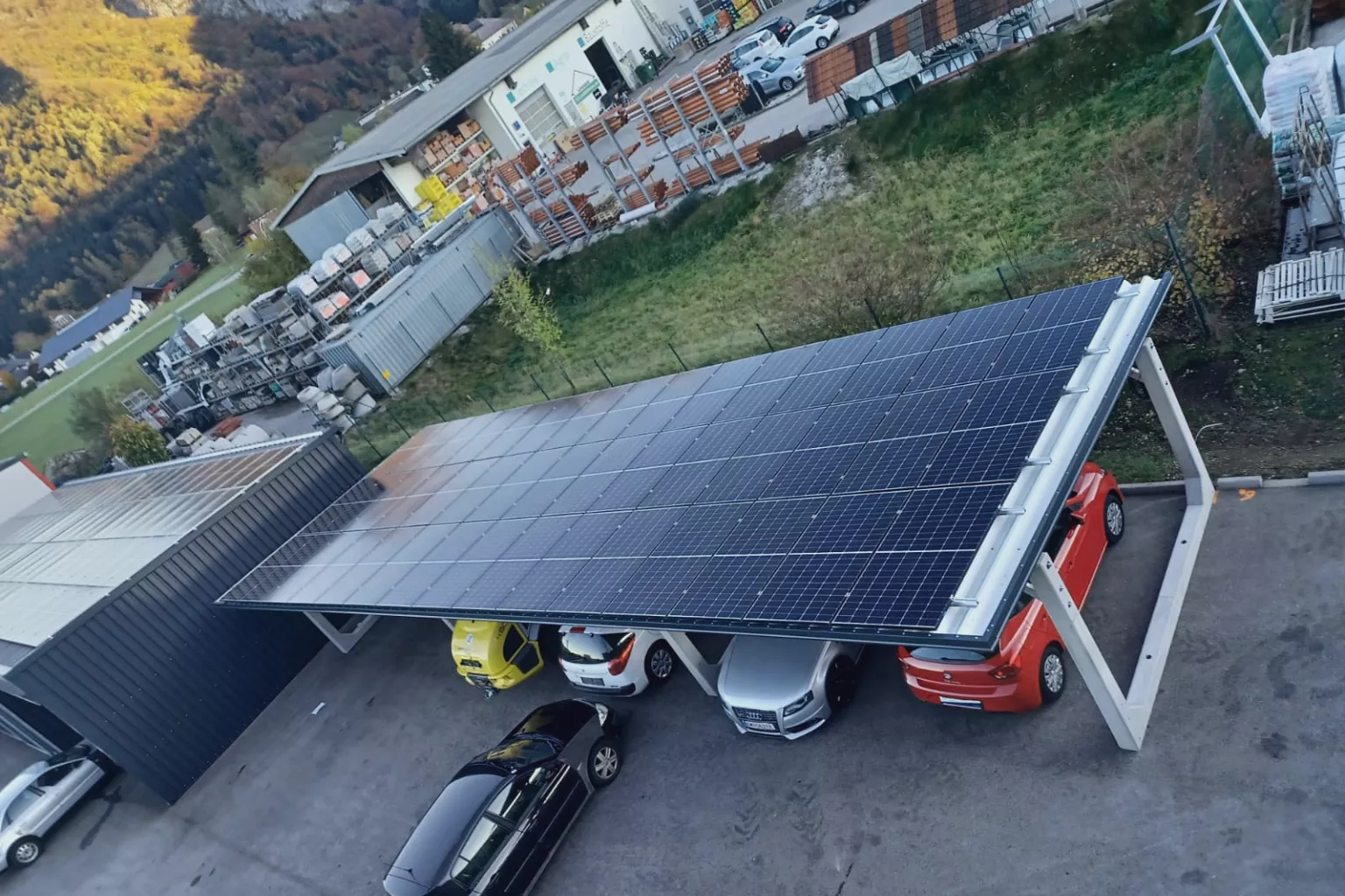 Beim Autohaus Almtal liefern Carports Sonnenstrom, nebenbei ersparen sie Ausgaben für teure Hagelnetze.